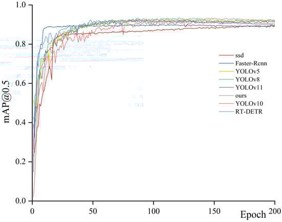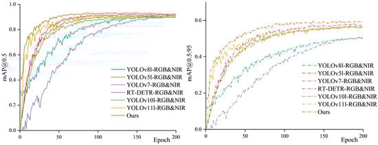 Figure 7 compares the mAP@0.5 and mAP@0.5:0.95 curves of the models from Table 4 during training, highlighting the superior convergence speed and accuracy of RT-DETR-MCDAF, particularly under stricter IoU thresholds. This demonstrated that MCDAF enhanced modality fusion, enabling clearer guidance for subsequent feature learning. Figure 10 presents a comparison of the detection results of the models listed in Table 4.
