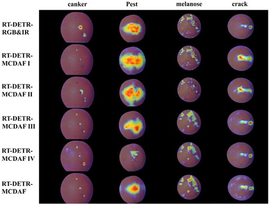 We employed gradient-weighted class activation mapping (Grad-CAM) [27] to visualize the heatmap and provide a visual representation of the attention of the model to citrus defect locations. Grad-CAM used target gradients to indicate attention intensity, with colors ranging from red (the highest attention) to yellow, green, and blue (the lowest attention). As shown in Figure 9, significant differences in the model performance were observed, particularly in the first column for small-area cankers. Models I–IV exhibited varying degrees of small-target perception loss, with Models I and II lacking attention mechanisms and showing the most severe deficiencies.