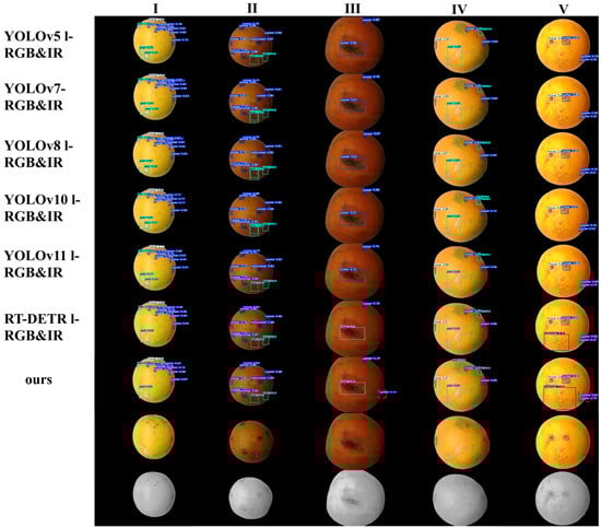 The canker defects varied in severity, appearing as small oily spots or spongy bulges, typically round in shape, as shown in Figure 10II,III,V (red dashed boxes). The proposed multimodal model accurately detected small oily spots and effectively identified canker lesions on both citrus surface edges and non-edge positions, demonstrating superior robustness in detecting small target canker defects.