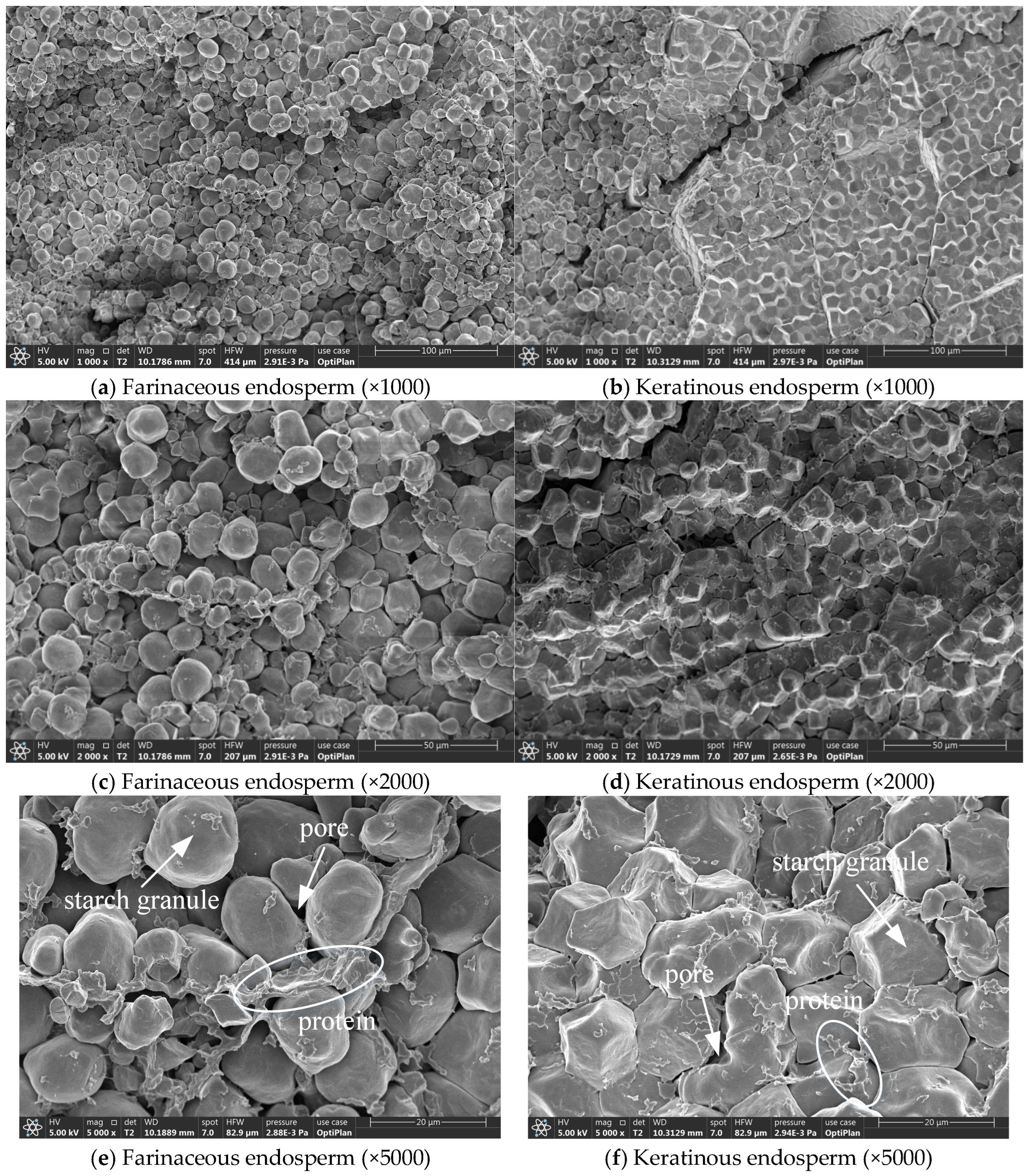- Yi, Z.; Zhang, H. Starch Granule Size, Pasting Properties and Textural Properties of Horny Endosperm and Silty Endosperm in Maize. J. Chin. Cereals Oils Assoc. 2014, 29, 27–32. [Google Scholar]