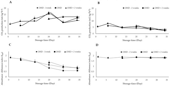 CO2 production and index of absorbance difference (IAD) of ‘Red Delicious’ (A,C) and ‘Granny Smith’ (B,D) during seven weeks of monitoring at 20 °C across three different ripening stages: ‘OHD − 2 weeks’, ‘OHD’, and ‘OHD + 2 weeks’. Bars refer to standard error.