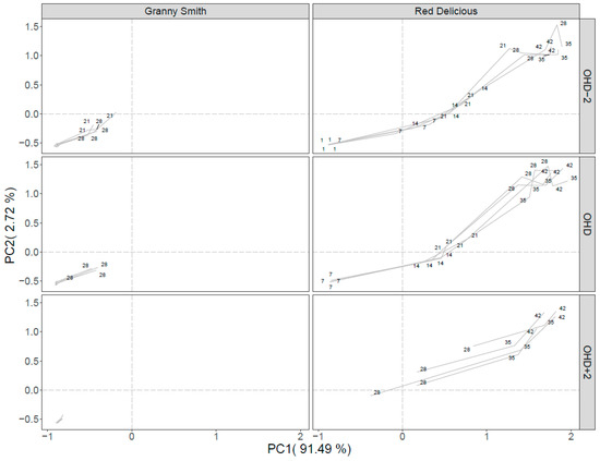 PCA score plot of apple VOCs measured by the PTR-ToF-MS of the cultivars ‘Granny Smith’ (left) and ‘Red Delicious’ (right), divided vertically by cultivar and horizontally by harvest times. The numbers indicate the measurement days from the beginning of the experiment.