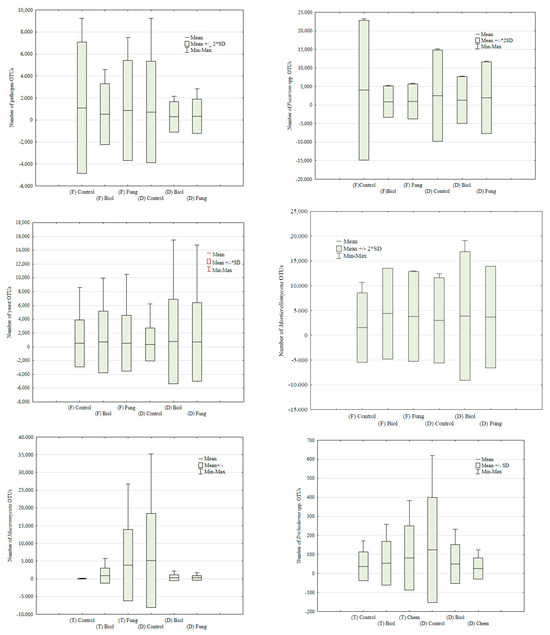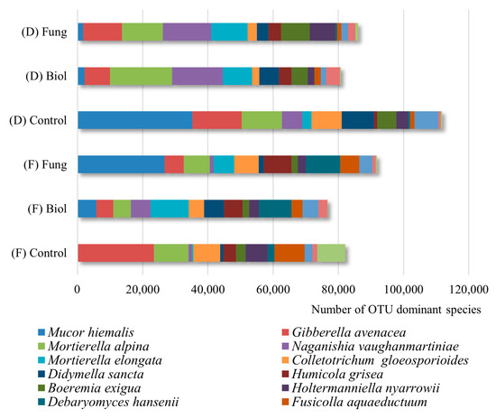 Nine species of the genus Mortierella were identified in this experiment. The abundance of Mortierella spp. increased considerably after both Fung and Biol treatments, which had positive implications for plant development. In the work of Ozimek and Hanaka [66], Mortierella spp. were classified as plant-growth-promoting fungi (PGPF), which improve the availability of P and Fe in soil. In addition, these species are well adapted to highly unsupportive environments, and they utilize carbon from polymers such as cellulose, hemicellulose, and chitin [66].