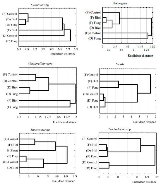 In the dendrograms generated for Fusarium spp., pathogens, yeasts, and Trichoderma spp. in different treatments, the control treatment (F) was completely different from the remaining clades (Figure 3). Yeasts were grouped mainly based on durum wheat cultivars. In turn, Mortierellomycota were grouped in clades based mainly on seed treatments.