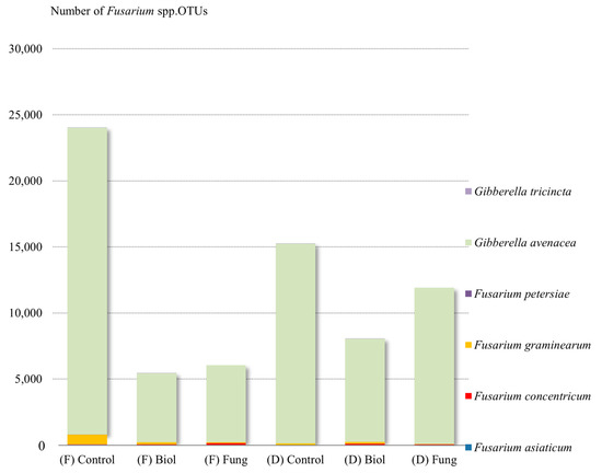 Fusarium species accounted for 9.9% of total OTUs. Six Fusarium species were identified, and Gibberella avenacea (anamorph: Fusarium avenaceum) was the dominant species (Figure 4). Seed dressing decreased the number of G. avenacea OTUs in the rhizosphere of both durum wheat cultivars. The abundance of Fusarium pathogens was reduced by 47.24% (cv. Durasol) to 87.4% (cv. Floradur) by the Biol treatment, and by 21.82% (cv. Durasol) to 74.85% (cv. Floradur) by the Fung treatment, relative to the control treatment.