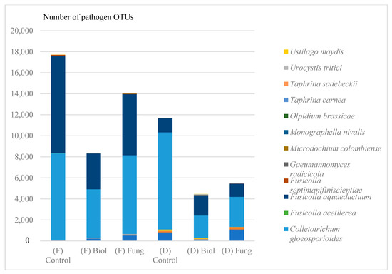 Number of OTUs of other potentially pathogenic fungal species. D—cv. Durasol, F—cv. Floradur. Biol—biological control, Fung—fungicide control.