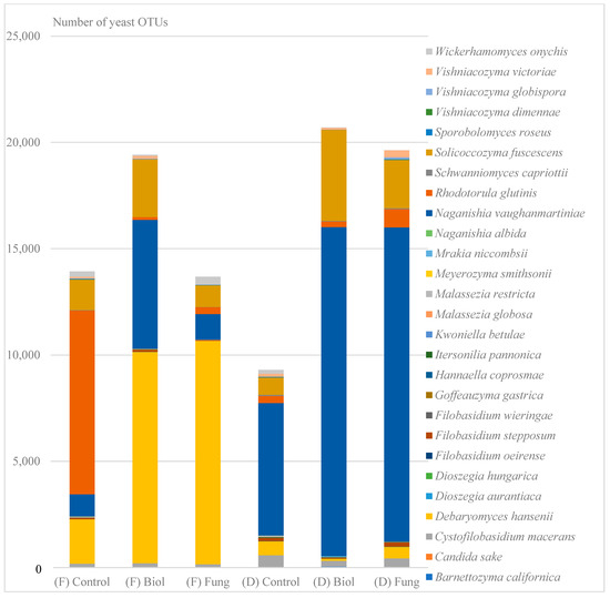 Number of yeast OTUs. D—cv. Durasol, F—cv. Floradur, Biol—biological control, Fung—fungicide control.