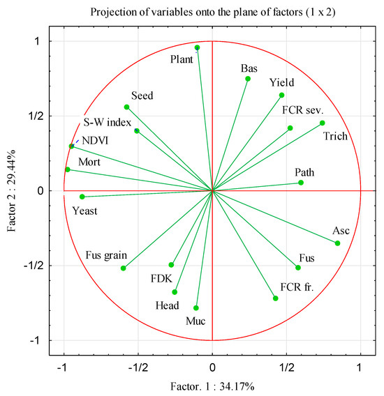 Principal component analysis of soil fungi (phylum or functional group), yields, and plant health. Bas—number of Basidiomycota OTUs in rhizosphere soil; FCR—severity of Fusarium crown root, Trich—number of Trichoderma OTUs in rhizosphere soil; Path—number of pathogenic OTUs in rhizosphere soil; Asc—number of Ascomycota OTUs in rhizosphere soil; Fus—number of Fusarium OTUs in rhizosphere soil; FCR fr.—incidence of Fusarium crown rot; Muc—number of Mucoromycota OTUs in rhizosphere soil; Head—spike density; FDK—Fusarium-damaged kernel; Fus grain—percentage of kernels colonized by Fusarium fungi; Yeast—number of yeast OTUs in rhizosphere soil; Mort—number of Mortierellomycota OTUs in rhizosphere soil; S-W index—Shannon–Wiener diversity index; Seed—number of seedlings in the two leaves unfolded stage; Plant—plant height. “x”—A multiplication sign.