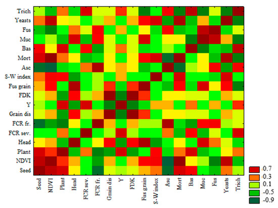 Heat map of the correlations between selected fungal species, yield, and the health status of durum wheat (refer to the key under Figure 7).
