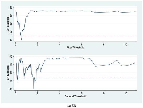 According to the mechanism above, the promotion effect of ER on AGTFP is affected by the level of agricultural TI. There may be a certain threshold in the level of agricultural TI. When it reaches the threshold point, the promotion effect of ER on AGTFP jumps or even deflects. Therefore, based on the benchmark regression, this paper refers to Hansen (1999) [40] to construct a panel threshold model to test whether there is a TI threshold effect in the process of ER on AGTFP.