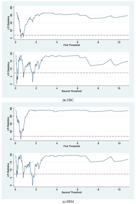 Table 9 displays the results of threshold estimation, the red dotted line represents the 5% critical value, while the blue line shows the likelihood ratio estimator. It reveals that the first and second thresholds for TI are identical for both ER and ERM, with values of 0.530 and 1.650. For ERC, the first and second thresholds for TI are 0.120 and 0.530, respectively. As for ERP, the first threshold for TI is 0.530, while the second threshold value is yet to be determined. To further assess the significance of these threshold values, this study utilizes the Likelihood Ratio (LR) to clearly illustrate the threshold values and confidence intervals of TI, as shown in Figure 2. The findings presented in the graph align with those in Table 8, thus confirming the accuracy of the threshold values.
