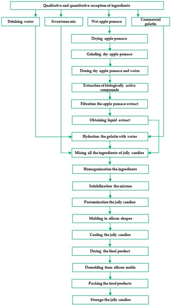 The technological flow used to make jelly candies with apple pomace extract is shown in Figure 3.