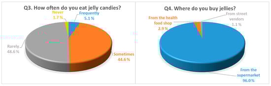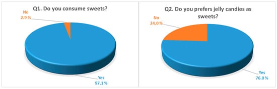 The answers to the survey show that the majority of the respondents consume sweets at a very high percentage of 97.1%, emphasizing a strong consumer preference for these food products (Figure 4, Q1). Asked if they consume jelly candies, 76.0% gave a positive answer (Figure 4, Q2), even though they consume it sometimes (44.6%) and rarely (48.6%) (Figure 5, Q3). These indicate that jelly candies are popular sweets. However, 5.1% of respondents frequently eat this type of sweet, and only 1.7% do not eat it at all.