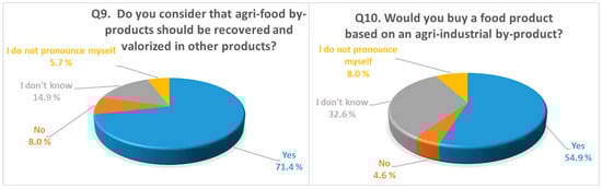 Moreover, a high percentage of 71.4% of the survey participants believe that agri-food waste should be used in other products (Figure 8, Q9). This reflects growing awareness of sustainability issues and the potential environmental and economic benefits of reducing food waste by finding new uses for agri-industrial by-products. Only 8.0% consider that this is not necessary. A percentage of 14.9% declare that they do not know if these residues should be reused and 5.7% cannot decide. Negative and undecided responses could indicate the need for additional information on the benefits of food waste reuse, as well as assurances regarding the safety and quality of the resulting products.
