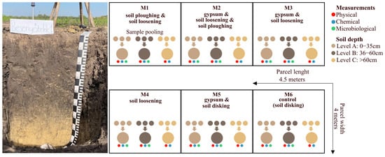 Experimental area. The figure illustrates the application of six different soil treatment methods (M1–M6), where M1 is soil ploughing and soil loosening; M2 is gypsum, soil loosening, and soil ploughing; M3 is gypsum and soil loosening; M4 is soil loosening; M5 is gypsum and soil disking; and M6 is control (soil disking). These treatments were analyzed across three distinct soil levels (A soil level: 0–35 cm; B soil level: 36–60 cm; C soil level: >60 cm).