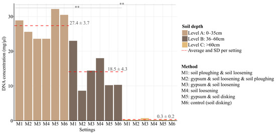 Changes in DNA concentrations at different soil levels. Bar plots show the differences in DNA concentrations between the methods (M), at three soil levels (A, B, C). The red dashed lines indicate the DNA concentration average of the settings corresponding to the soil levels. Asterisks indicate significant differences between A vs. B and A vs. C soil levels, ** p < 0.01.