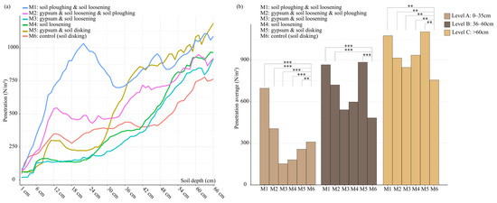 The effect of different tillage methods combined with gypsum amendment on soil penetration resistance (N/m2). In panel (a), the line plots illustrate the variation in penetration resistance (y axis) across the different soil depths (x axis). The different line colors represent the six tillage methods (M1–M6). In panel (b), the bar plots highlight the differences in penetration average (y axis) within the three soil levels (A, B, C) under the six different tillage methods (x axis). Asterisks indicate significant differences, with ** p < 0.01, and *** p < 0.001. Comparisons were performed between the control and all other methods.