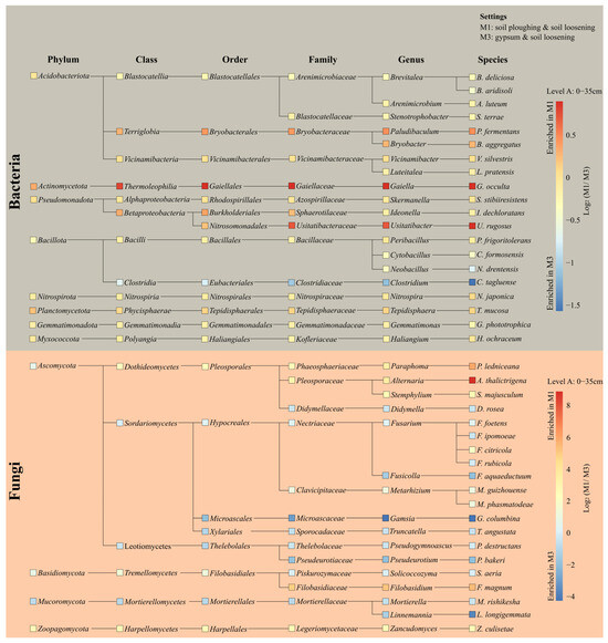 Variations in microbial community abundance at soil level A. The composite heat map displays the log2 ratios of microbial taxa across phylum, class, order, family, genus, and species levels in soil layer A, representing the top 20 species in both bacterial and fungal communities. Differences are visualized on a log scale as the logarithm of soil M1/M3. Differences are illustrated with gradient colors, where the red scale represents the dominance of taxa in method M1, whereas the blue scale represents the taxa dominant in method M3. Lines connect related taxa.