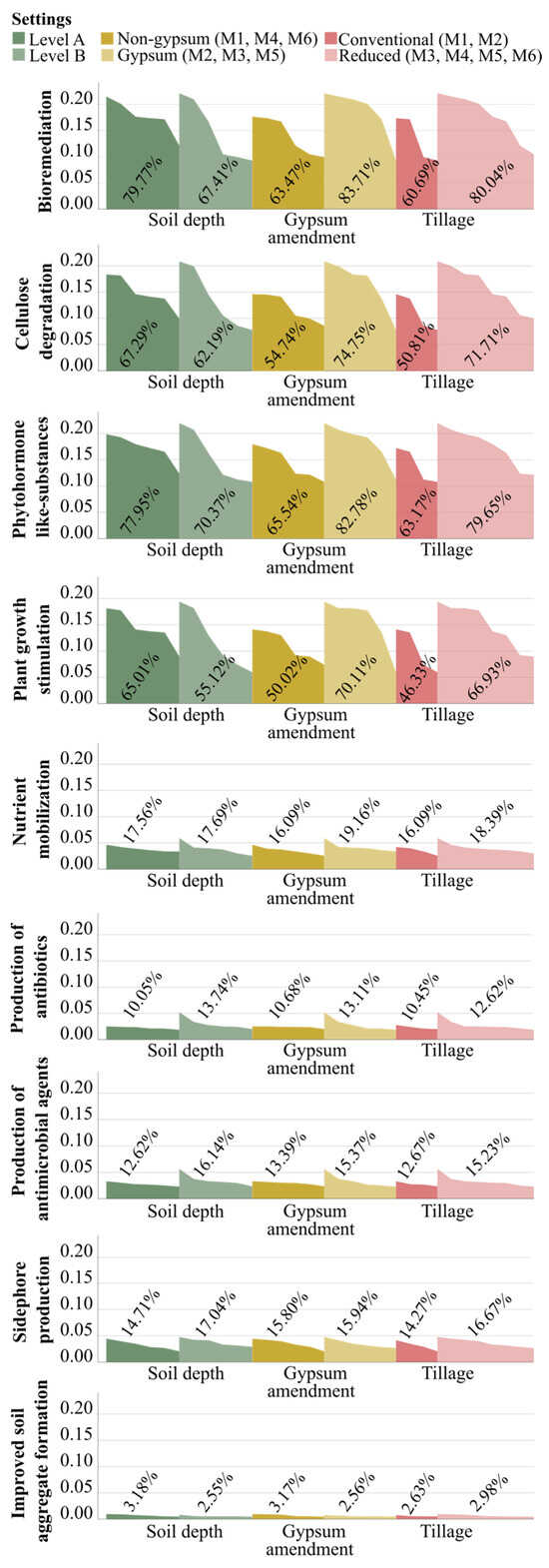 M3, however, was shown to create an environment that favored microbial communities responsible for key ecosystem functions, including bioremediation, plant growth promotion, and nutrient cycling. By preserving microbial habitats and organic matter, reduced tillage sustains microbial activity, while gypsum application further enhances these effects by improving soil chemistry and moisture retention. Our results demonstrate that beneficial microbial genera associated with bioremediation, phytohormone production, and plant growth promotion were significantly more abundant at soil level A. This enrichment is primarily linked to higher organic matter content, improved aeration, and root exudates, all of which are preserved under reduced tillage. These conditions create microenvironments that enhance microbial interactions and nutrient mobilization, supporting long-term soil health and crop productivity. Previous studies have similarly highlighted the role of rhizosphere bacteria in promoting plant resilience and biocontrol [117]. Additionally, the vertical distribution of organic carbon and nitrogen has been shown to influence microbial activity [118], further supporting our findings that soil level A provides optimal conditions for functionally beneficial microbes. In contrast, the deeper soil level (B) exhibited a higher prevalence of specific functional genera adapted to nutrient-limited conditions. Siderophore-producing genera were particularly abundant in this layer, likely due to the lower iron availability caused by the high pH and elevated CaCO3 content. These microorganisms play a crucial role in iron solubilization and uptake, supporting plant and microbial metabolism under iron-limiting conditions [119]. Additionally, genera associated with antibiotic and antimicrobial production were more prominent at soil level B, a pattern that aligns with findings from studies on microbial competition in oligotrophic environments [120]. The lower availability of organic matter and microbial diversity at deeper levels likely exert selective pressure, favoring microbes that produce antimicrobial compounds to outcompete others.