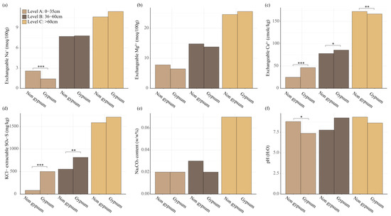 Changes in chemical parameters for treatments. The bar plots show the differences calculated between applied gypsum and non-applied gypsum soil samples (x axis) from three soil levels (A, B, C) for different chemical parameters (y axis: (a) Exchangeable Na+, (b) exchangeable Mg2+, (c) exchangeable Ca+, (d) KCl− exchangeable SO4−S, (e) Na2CO3, (f) pH). Asterisks indicate significant differences between applied gypsum and non-applied gypsum samples, with * p < 0.05, ** p < 0.01, and *** p < 0.001.