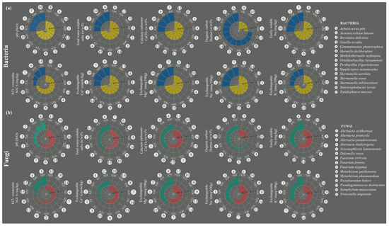Correlations between chemical parameters and taxonomic species in gypsum-amended areas. The polar plots display the relationships between chemical parameters and microbial communities ((a) bacteria, (b) fungi), focusing on the top 15 species, which are labeled with numbers 1–15. Positive correlations are represented by blue and green, while negative correlations are indicated by yellow and red. Correlation values for each species are shown at the edges of the plots.