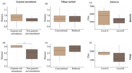 Alpha diversity in different settings. The box plots visualize soil diversity under different settings: gypsum amendment (Shannon index), tillage methods (Shannon index), and soil levels (Chao index). Panels (a–c) represent bacterial community diversity, while panels (d–f) represent fungal community diversity in the soil samples. Asterisks indicate significant differences, with * p < 0.05.