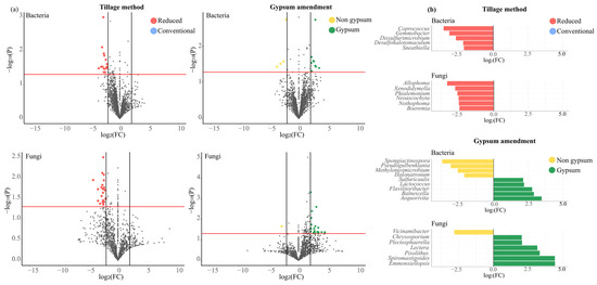 Significant changes in genus taxonomic level. In panel (a), the volcano plots illustrate the significantly different genera between different settings, where those showing changes in reduced tillage are colored with yellow, those in conventional tillage are colored with purple, those in soils with gypsum application are marked with red, and those in soils with non-gypsum application are marked with green. Gray dots represent genera that did not change significantly between settings. The x axis represents the logarithm of fold change (log2(FC)), which is significant when log2(FC) > 2 or log2(FC) < −2, while the y axis represents the logarithm of statistical significance (p value) (−log10(p)), which is significant when log10(p) > 1.3. In panel (b), the horizontal bar plots represent the highest absolute fold change changes in each setting.