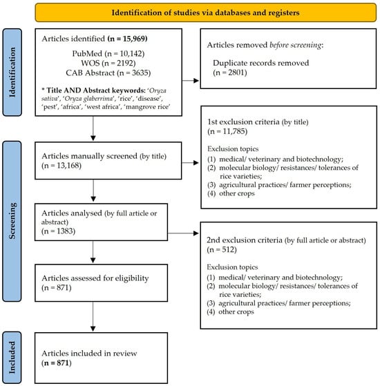 For the data extraction of available publications assessing rice pests and diseases worldwide, with emphasis on West Africa and mangrove production, three databases were used: PubMed (https://pubmed.ncbi.nlm.nih.gov/, accessed on 20 April 2024), Web of Science (WOS) (https://www.webofscience.com/, accessed on 20 April 2024), and CAB Abstract (https://www.cabdirect.org/, accessed on 20 April 2024). Following the PRISMA guidelines [34], a set of specific keywords combination were searched according to four search queries: (i) rice pests and diseases characterization in the world; (ii) rice pests and diseases characterization in Africa; (iii) rice pests and diseases characterization in West Africa; (iv) characterization of mangrove rice pests and diseases—from world to West Africa (the main rice-producing region within the mangrove agroecosystem and the pivotal region of African rice—O. glaberrima—production). Different combinations of keywords using ‘AND’ included ‘Oryza sativa’, ‘Oryza glaberrima’, ‘rice’, ‘disease’, ‘pest’, ‘africa’, ‘west africa’, and ‘mangrove rice’. The complete list of keyword combinations, as well as the Boolean operators applied to each bibliographic database, is detailed at Table S1. To cover the largest number of studies in the data search, all publications were considered, regardless of written language, availability of the full text, or type of publication (e.g., review). Whenever articles in languages other than English were analyzed, a standard translation tool (Google Translator) was used to extract the most relevant information.