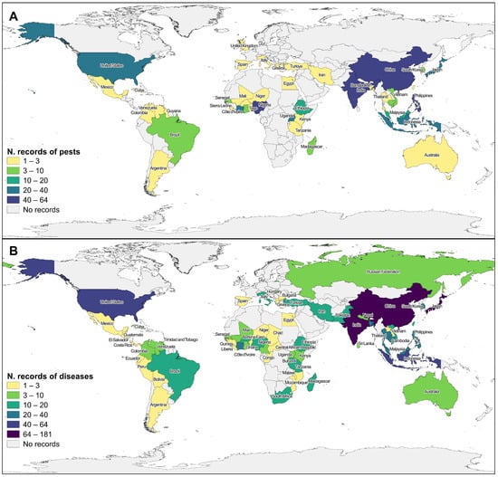 Geographical distribution of total records included in the review for pests (A) and diseases (B). Countries with no data available are represented in gray. Color differences represent different record value classes according to records screened.