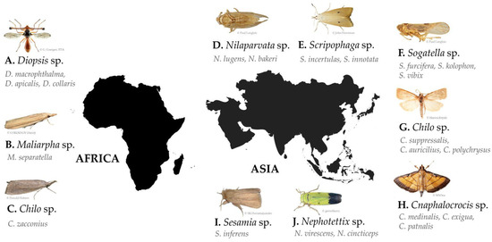A total of 343 records of pests associated with rice damage were identified from the 140 final publications grouped in the pest subject. These records are represented by three phyla: Arthropoda (335), Chordata (6, with 4 from the Mammal class and 2 from the Bird class), and Annelida (2). Arthropoda records, with the highest number, are dominated by the class Insecta, with 329 records. Insecta branches into seven orders, mostly represented by Lepidoptera and Hemiptera species. Among these, 84 genera have been recorded, representing 118 species. The 329 insect records were characterized by the type of study applied: pest status (260), identification (44), and pest risk (25). Of the total records of the class Insecta, 44 provided information on being a major pest. Given the global distribution of records and the low number of resulting records, a minimum of six records per genus was classified as an important top pest for Africa and Asia. Having defined this, it is possible to observe that, in Africa, references predominate in three genera: Diopsis (17%), Maliarpha (8%), and Chilo (6%). Of these genera, the following species are represented: D. macrophthalma, D. apicalis, D. collaris, M. separatella, and C. zacconius (Figure 3A–C). In Asia, there are seven genera most referred to: Nilaparvata (10%), Scirpophaga (9%), Sogatella (7%), Chilo (6%), Cnaphalocrocis (6%), Sesamia (4%), and Nephotettix (3%). Of these genera, the following species are represented: (a) Nilaparvata lugens, and only with one record, N. bakeri; (b) Scirpophaga incertulas, S. innotata; (c) Sogatella furcifera, and with only one record each, S. kolophon and S. vibix; (d) Chilo suppressalis, and only with one record each, C. auricilius and C. polychrysus; (e) Cnaphalocrocis medinalis, and with two records, C. exigua, and with only one record C. patnalis; (f) Sesamia inferens; and (g) Nephotettix spp. (including N. virescens and N. cincticeps) (Figure 3D–J). Please check Table S2 for insect pest synonyms and other relevant data.