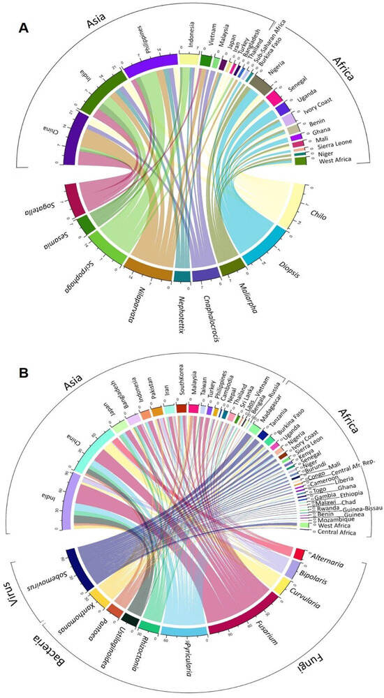 Chord diagram shows the number of top pest genera (A) and diseases (B) recorded in each country or region (e.g., West Africa, sub-Sahara). Diseases grouped by microorganism type: fungi, bacteria, and virus.