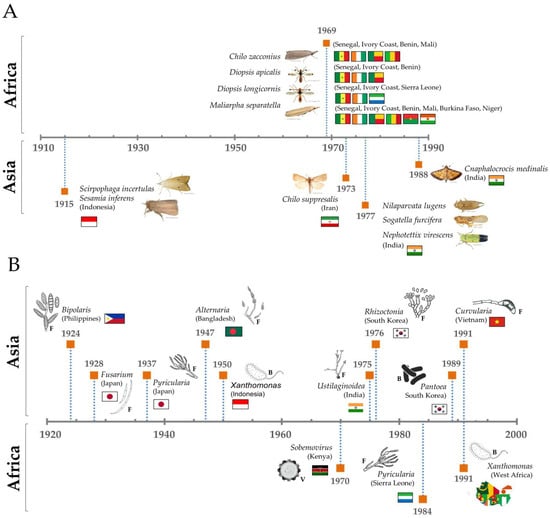 Timeline scheme with the first record compiled of each top pest (A) and disease (B) and its respective country of study. Letters correspond to the type of pathogen: F = fungi, B = bacteria and V = virus.