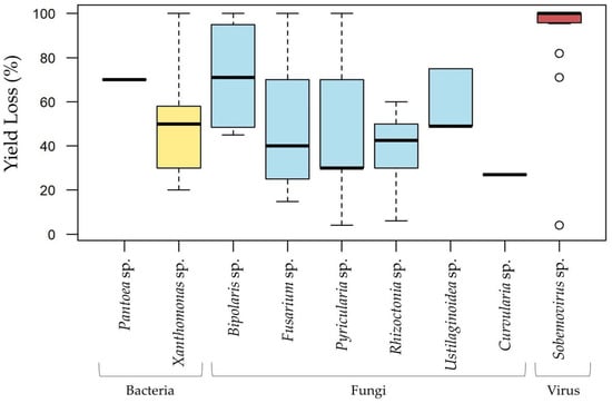Maximum yield loss percentages at the disease level retrieved from the records screened show that one bacteria genus (Xanthomonas), three fungal genera (Bipolaris, Fusarium, and Pyricularia), and one viral genus (Sobemovirus) were reported to cause total yield loss (Figure 6). The bacterial genus Pantoea was associated with losses of 70%, while the fungal genera Rhizoctonia, Ustilaginoidea, and Curvularia were reported with maximum losses of 60%, 75%, and 27%, respectively (Figure 6).