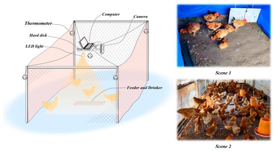The broiler chickens used in this study were obtained from two commercial farms in Shandong and Guangdong, China. Neither the age nor the gender of the chickens was pre-selected to ensure that normal commercial farming processes remained unperturbed. Over 100 broiler chickens were encompassed within the data collection scope. Specifically, Scene 1 involved 10 Sanhuang chickens, and Scene 2 involved around 100 Jiangfeng Lujiao chickens. The experimental environment is shown in Figure 1. The breeding density of scenario 1 was lower (1.28 birds/m2), while that of scenario 2 was higher (2.4 birds/m2). The environment of the two scenes was the same except for the temperature and humidity environment, which was a semi-enclosed house area with three sides closed and one side open. Food and drinking equipment were placed in the area, allowing the chickens to eat and drink freely. The average daytime temperature of Scenario 1 and Scenario 2 during data collection was 7.5 °C and 20.5 °C, respectively. A daylight LED lamp was installed beneath the imaging platform to ensure that the daytime brightness within the camera’s field of view was at least 50 Lux. The experimental environment was implemented under the guidance of Directive 2010/63/EU and was approved by the ethics committee to ensure the welfare of the animals.