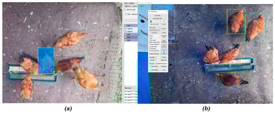 LabelImg1.8.6 was used to mark the selected broiler images (see Figure 2a for example), and the dataset was in YOLO format. In the labeling process, the rectangular box was dragged to delimit the location of a broiler and give it a behavior label.