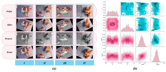 The dataset was augmented through data enhancement techniques, including rotation, random pixel removal, and affine transformation. The effect of the image enhancement is depicted in Figure 3a. Figure 3b shows the distribution of label sizes before and after data enhancement. The change in the scatter plot area demonstrates that the operations effectively expanded the scale distribution of the detection boxes, making the positions and scales of the detection boxes more reasonable. Ultimately, the dataset was randomly divided into subsets at a ratio of 6:2:2.