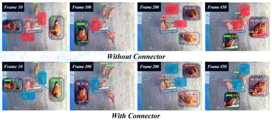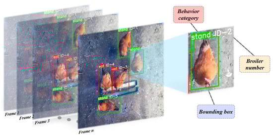 As a result, the tracking part of ODBO is transformed into an MOT task involving only one type of target (broiler chickens). This undoubtedly significantly enhances the accuracy and stability of the tracking task. The receiving part of the Tracker does not delete the behavior category information. Instead, it adds this information as additional data to the tracking output to match the behavior information with the ID of the broiler chicken (as shown in Figure 4).