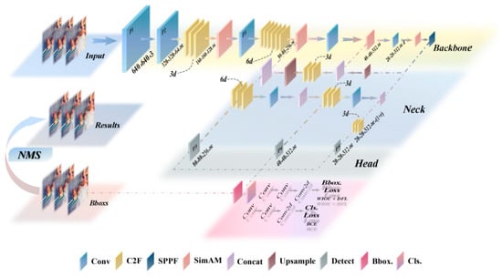 where represents the class confidence, which is the probability that the object within the detection box belongs to a specific class, and is the probability related to the IOU between the predicted box and the ground truth box. In the YOLOv8 model, the calculation of is accomplished by the Sigmoid function, and the calculation method is as shown in Equation (6):