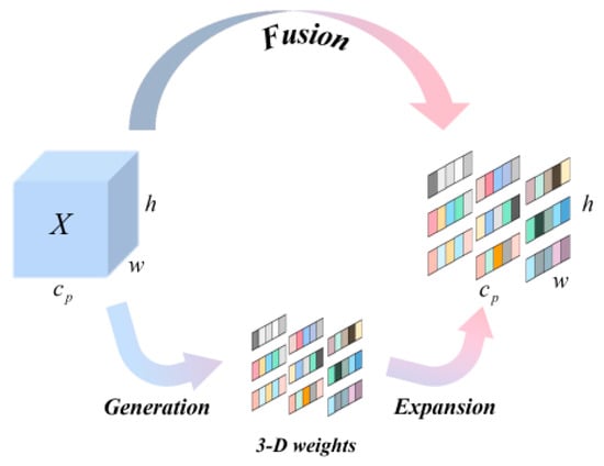 In object detection tasks, incorporating attention mechanism modules is a common approach to boost a model’s feature extraction capabilities [30,31,32]. Liang et al. [33] integrated the CBAM attention module into YOLOv5, improving the recognition accuracy of small targets. As a simple and efficient attention module, SimAM [34] can infer the 3D attention weights of feature maps in a layer without adding extra parameters to the original network. The inference process is depicted in Figure 6. Compared with traditional attention mechanism modules, SimAM enhances the module’s capacity to learn discriminative cues, thus boosting the model’s ability to focus on the key features of different broiler chicken behaviors in overhead shot scenarios. As shown in Figure 5, in the backbone network, the C2f feature extraction module was swapped with SimAM to address the weak feature extraction ability of YOLOv8 in this study.