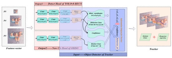 The Connector consists of two sub-parts: a single class output head located in the detection head of YOLOv8-BeCS and a corresponding receiving part in the Tracker. First, the single class output head (Output2 in Figure 8) is improved based on the original class detection head (Cls Head of Output1 in Figure 8) in YOLOv8. Without altering the prediction probabilities of the Cls Head, the new single Cls Head reduces the dimension through a operation and outputs a single class number: 0. In this task, this class is designated as broiler chickens. Meanwhile, compared to the original classification head, the number of classes (nc) of C3 in the newly added classification head is set to 1. This adjustment not only ensures the stability of class output but also decreases the computational complexity. After that, we reconstructed the receiver in the Tracker. Specifically, the input and output format of the “Objdetector” function in the Sort series code is changed. It takes the four items of data output from the three detection headers (green structure in the Input section of Figure 8) and passes them to the “Objtracker” function for tracking. Objtracker and the consequent parameters of each function of the process have to carry four real Behaviors of information (x1, y1, x2, y2, 0, the Conf, behaviors). This change depends on the flow of arguments between the functions of the Sort family of algorithms, so we will use it later in the trace structure.
