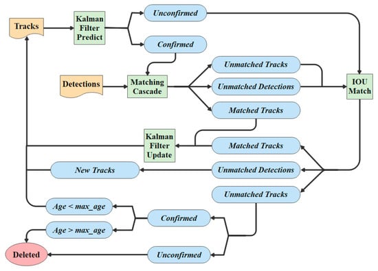 The combination of Mahalanobis distance and the characteristic cosine distance enables the application of motion information and appearance information, effectively resolving the issue of ID loss when the broiler is blocked but reappears later. The specific matching process for Sort is illustrated in Figure 9.