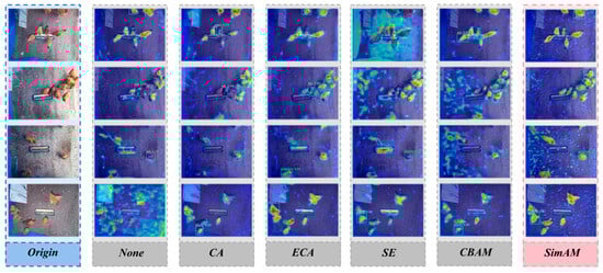 The C2f module in YOLOv8 has limited efficacy in extracting salient features for differentiating different broiler chicken behaviors. These relatively small-scale key features directly impact the model’s recognition performance. Figure 10 shows that the C2f module overemphasizes feature extraction from the image’s background and irrelevant pixels. This hinders the model from focusing on the target’s detailed features, consequently affecting the model’s overall accuracy. With the introduction of the SimAM attention module, the key features in the image details are accentuated, and the model’s overall classification accuracy improves significantly, with P increasing by 3.5% (Table 2). Compared with other common attention mechanisms, such as CA, ECA, SE, and CBAM, SimAM can better focus on key features.