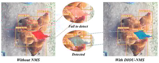 In object detection output, multiple bounding boxes (bboxes) of varying sizes, positions, and angles often exist. These boxes may overlap and cover the same target. The NMS algorithm serves to eliminate these redundant boxes and select the optimal one for target description. In agricultural production, target clustering and mutual occlusion scenarios are common, so NMS is also widely applied. For instance, Zhang et al. [35] and Shen et al. [36] enhanced their models’ performance by introducing NMS processing. To reduce false positives and negatives due to free-range broiler chicken clustering, NMS was incorporated in the post-processing stage.