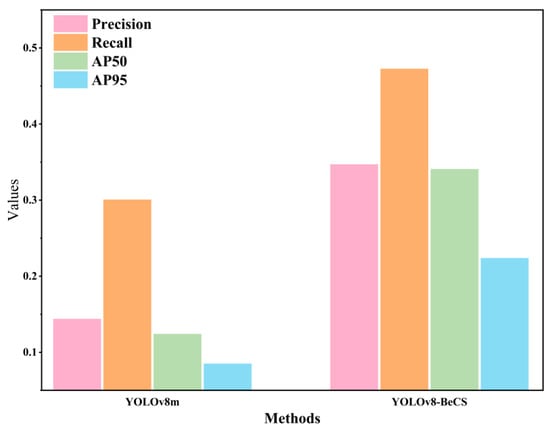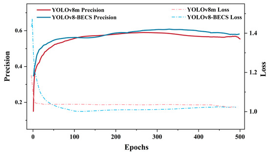 Figure 14 shows the precision and loss changes of the fine-tuned YOLOv8m and YOLOv8-BeCS models during 500 training rounds. Initially, YOLOv8-BeCS quickly enhanced its precision thanks to prior information, while YOLOv8m lagged in progress due to weight matching difficulties. After 100 training rounds, the precision gap between the two models narrowed. At the 300-round mark, the precision of both models peaked but subsequently declined, possibly due to overfitting impacting the testing performance.