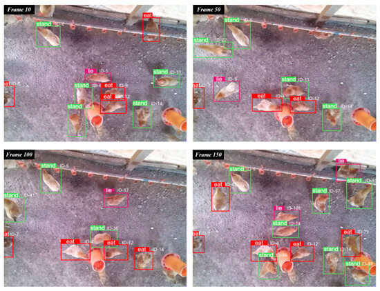However, most current methods either detect behaviors or track individuals without integrating both aspects, which hinders the monitoring of continuous behavioral patterns. This is because most research in the multi-object tracking (MOT) field focuses solely on objects of a specific category. Behavior recognition results involve multiple behavior categories. In an image, changes in different behaviors not only impact behavior recognition but can also alter the behavioral characteristics and appearance models of broiler chickens, potentially leading to tracking failure [26]. To tackle the issue of the detector’s output of multiple-behavior-category information in the MOT task affecting broiler chicken tracking, some current studies employ multi-step approaches to associate specific behaviors with broiler chicken identities. For instance, Nasiri et al. [27] performed two-step detections, concurrently detecting broiler chickens and their drinking behaviors. They utilized the single category results from broiler chicken detection for tracking. Finally, the tracking results were matched with the drinking behavior detection results to estimate the broiler chickens’ drinking time. However, excessive detection processes and matching procedures demand substantial computational resources, rendering it difficult to implement in commercial farming. Meanwhile, the cumbersome procedures may also cause errors to be continuously transmitted and amplified, resulting in poor method stability.