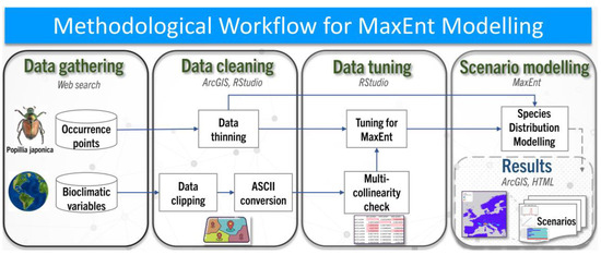 The presence data for P. japonica and the bioclimatic variables needed further refinement to be used in the MaxEnt scenario modelling phases. Data pre-processing, data tuning and spatial representation were performed using ArcGIS Pro 3.2 and RStudio (Version 2024.04) to ensure data accuracy and consistency for the MaxEnt modelling analysis. The workflow diagram in Figure 1 provides a comprehensive overview of the methodological steps employed in this study.
