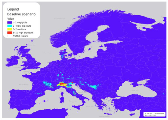 Figure 3 shows the reclassified areas in Europe across the NUTS2 regions, where P. japonica populations are likely to be established under baseline climatic conditions (not reclassified map in Table S4). Most of Europe shows negligible exposure (purple), including the coastal regions bordering the Mediterranean Sea, and all areas below 41.5° north latitude (e.g., Zaragoza in Spain, across Rome in Italy, and northern regions in Greece). The model predicted extensive hotspot areas with threshold value >0.4 (red and yellow areas) in northern Italy and along the Alpine valley floors, and other less extensive areas in central Italy (Abruzzo), France (Rhône Alpes), and Serbia (the Šumadija and Western Serbia).