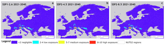 The potential distribution of P. japonica under the three near-term climate scenarios is shown in Figure 4, presented as reclassified areas across NUTS2 regions. Compared to the baseline climate scenario, the SSP1-2.6 scenario (Figure 4a) showed an eastward expansion of low exposure areas (light blue), with inside large patches of medium exposure (yellow) appearing in Eastern Europe. These areas lie between approximately 46° north latitude (near Zagreb, Croatia) and 44° north latitude (near Sarajevo, Bosnia-Herzegovina). In contrast, high and medium exposure areas in most of the Po Valley (Italy) showed a contraction. Other expansions of low exposure areas were observed in France, southern Germany, and Austria. Overall, the pattern remained largely stable, suggesting that SSP1-2.6 (a conservative climate scenario) has a limited impact on the extent and distribution of these areas. Compared to the baseline scenario, the differences between the SSP2-4.5 scenario were relatively slight (Figure 4b), whereas the SSP2-8.5 scenario exhibited an expansion in Germany and France, along with a decline in the Balkans (Figure 4c).