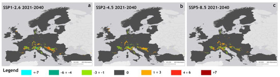 Changes of suitable areas of P. japonica in Europe compared to baseline under the scenarios SSP1–2.6 (a), SSP2–4.5 (b), and SSP5–8.5 (c) for the period 2021–2040.