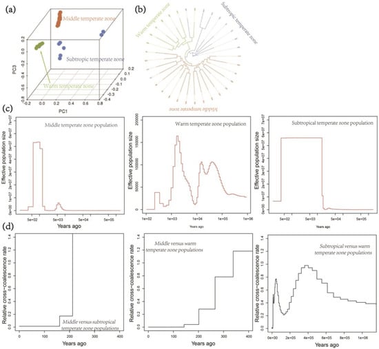 Overall, the three populations were all collected from locations in relatively low temperate climates, underlining the shade-loving feature of C. militaris and implying that the spread of C. militaris may be from north to south in China. On the other hand, the three populations presented different population sizes, with a pattern of subtropical zone > middle temperate zone > warm temperate zone (Figure S1a). In particular, the subtropical and middle temperate zone populations showed much larger population sizes than the warm temperate zone population, further implying the shade-loving feature and north-to-south migration.